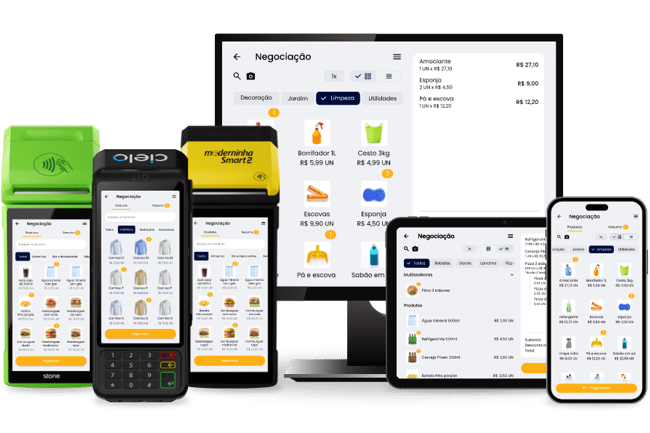 Use o leitor de código de barras, busca inteligente ou a divisão por categorias para adicionar produtos ao caixa e finalizar vendas usando diversas formas de pagamento.
